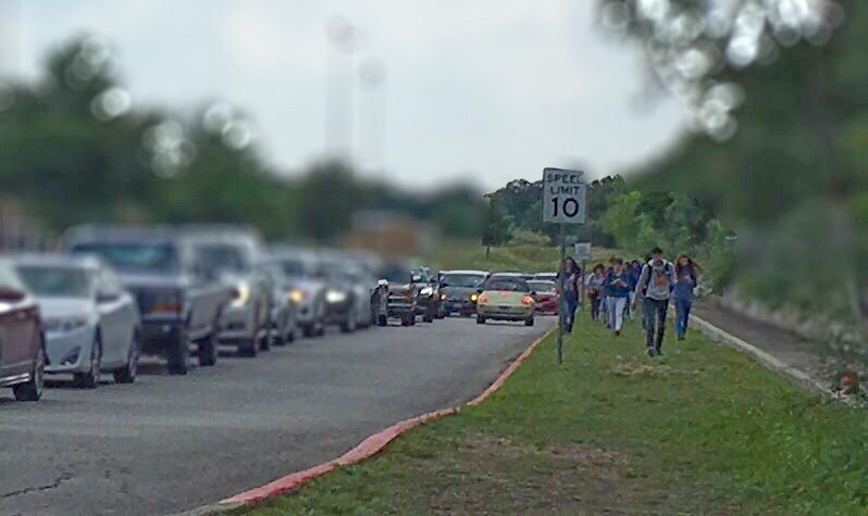 In the afternoon, when the traffic is heaviest, students either stay on the school sidewalk and cross traffic at the intersection where cars are hurriedly turning to get to the parking lot or are looking for quick moments to exit onto Kyle Seale.